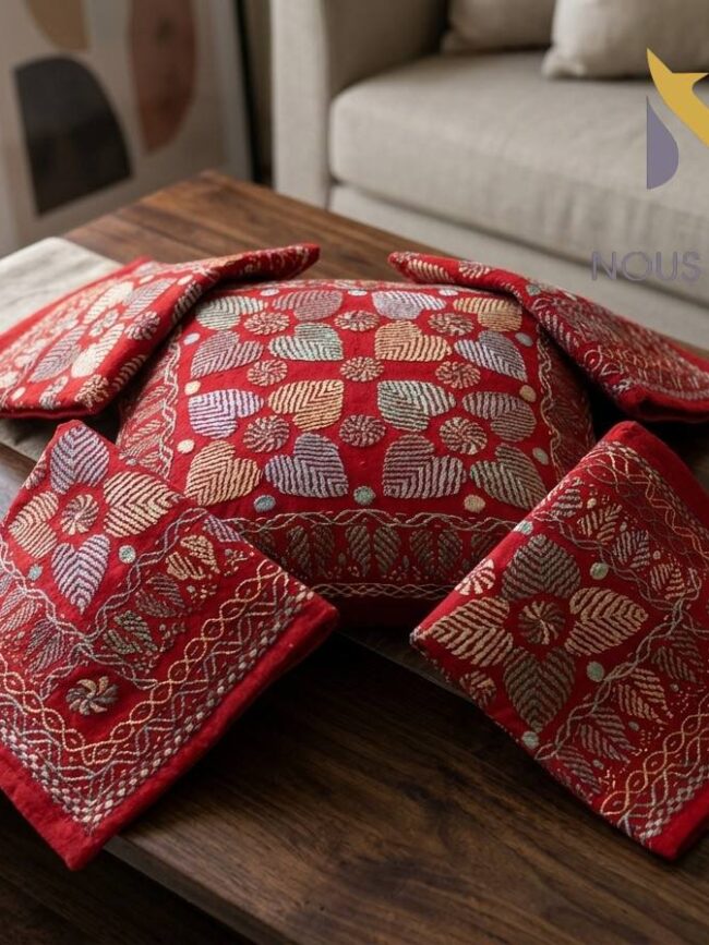 Timeless Bengali artistry to your living space with this stunning Nakshi Hand Stitch Red Cushion Cover 3. Crafted by skilled artisans, this piece reflects the rich heritage of traditional Nakshi Kantha stitching, known for its delicate patterns, fine detailing and cultural storytelling. The vibrant red base enhances any room décor, making it an eye-catching addition to your sofa, bed or lounge seating. The intricate hand stitching brings a unique handcrafted charm that machine-made products simply can’t replicate.✨ Key Features