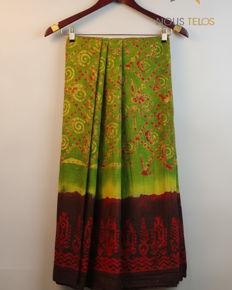 Effortless style with the Batik Hand Block Print Cotton Saree, a perfect combination of traditional Batik artistry and the airy comfort of cotton. This saree stands out with its vibrant green with maroon hue, handcrafted batik patterns and soft, breathable texture—ideal for women who love elegant ethnic wear that feels as good as it looks. this saree brings charm, comfort and sophistication to any occasion.