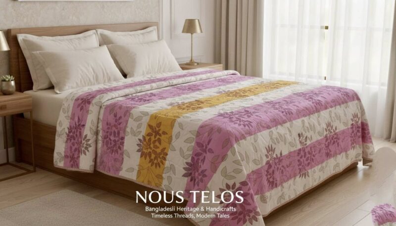 Skilled artisans craft each katha with traditional Nakshi embroidery, showcasing floral motifs, geometric patterns, and cultural storytelling through fine, detailed stitches.