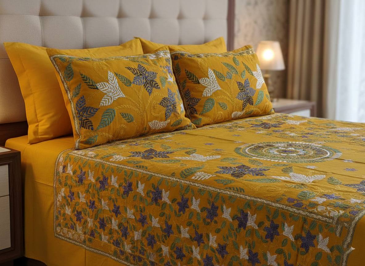 Yellow Nakshi Stitches Bed Sheet with Pillow Covers
